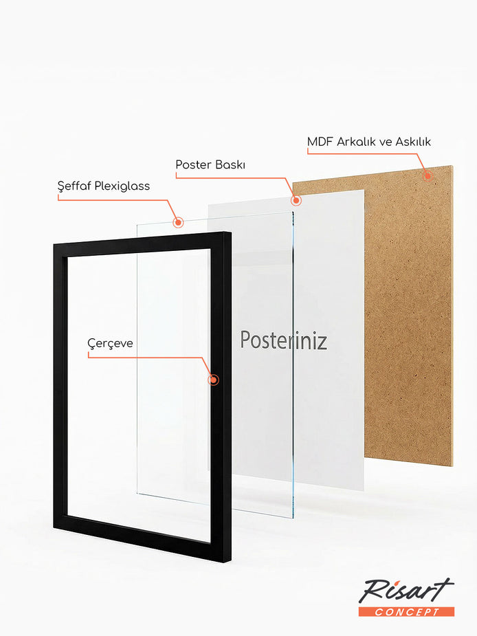 Poster, sağlam bir yapı için MDF arkalık ile desteklenir ve modern çizgilere sahip çerçeve içine yerleştirilir.